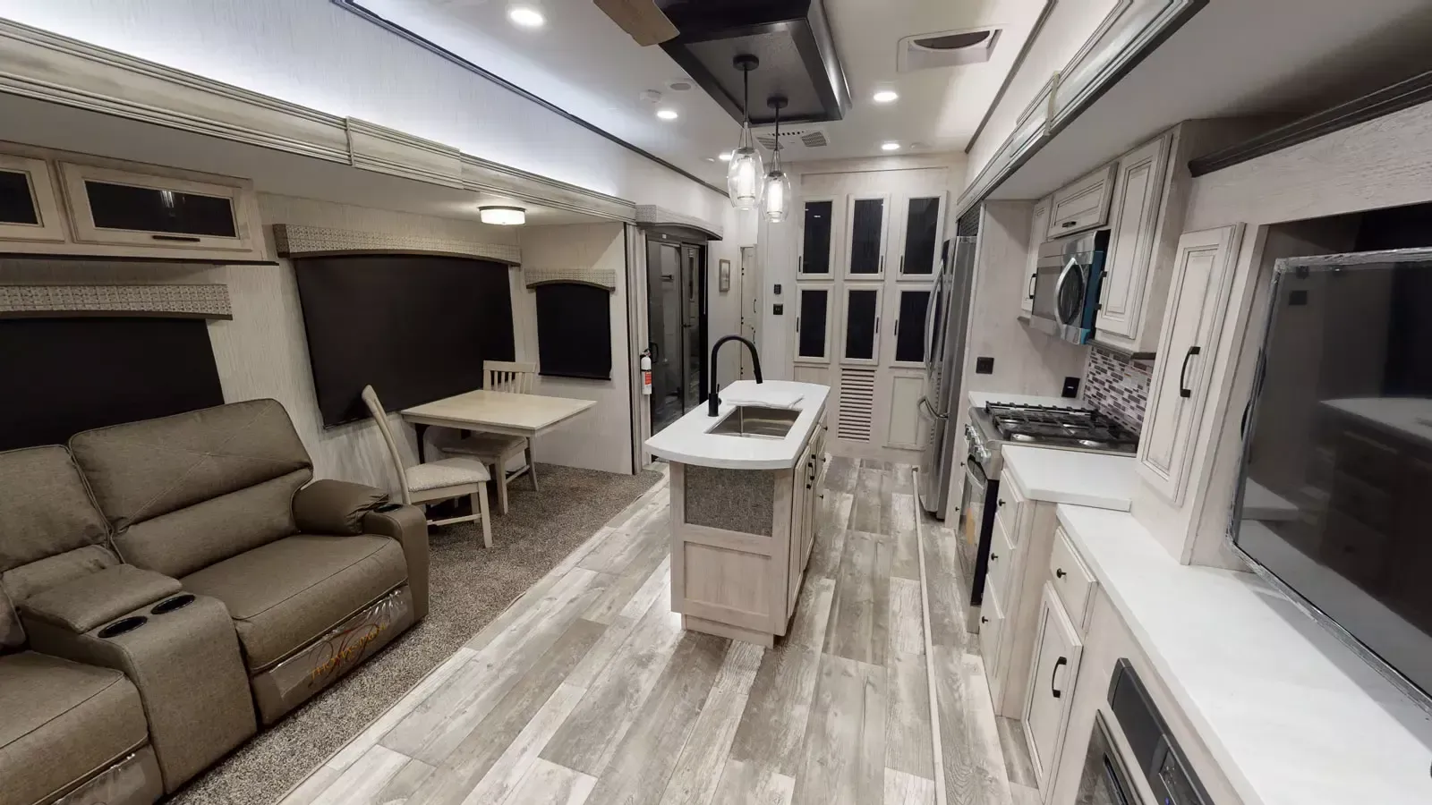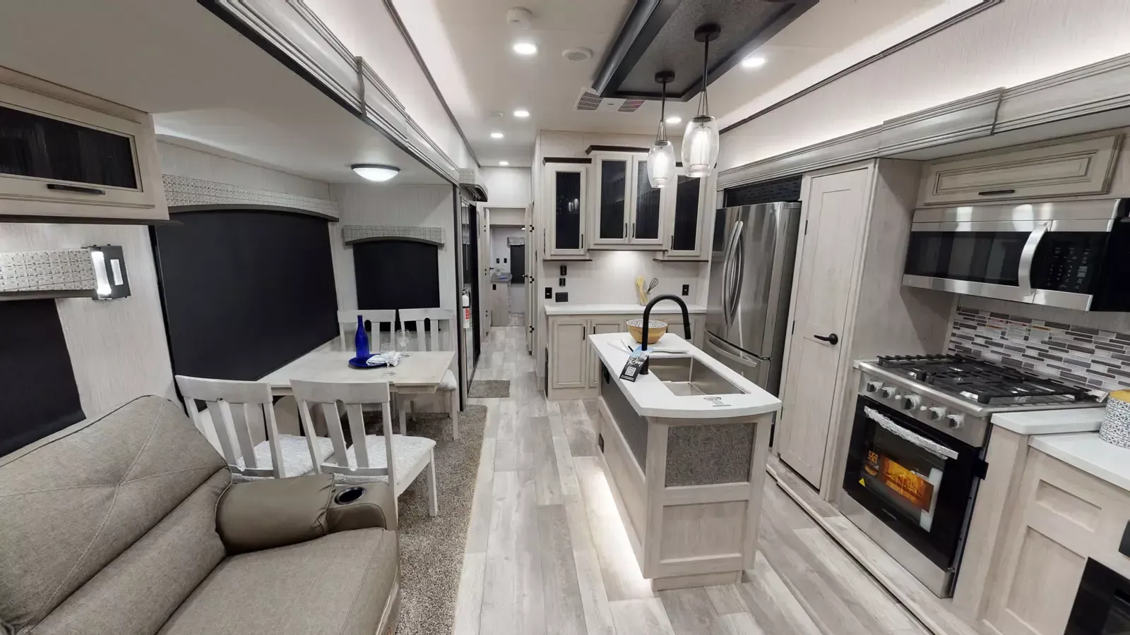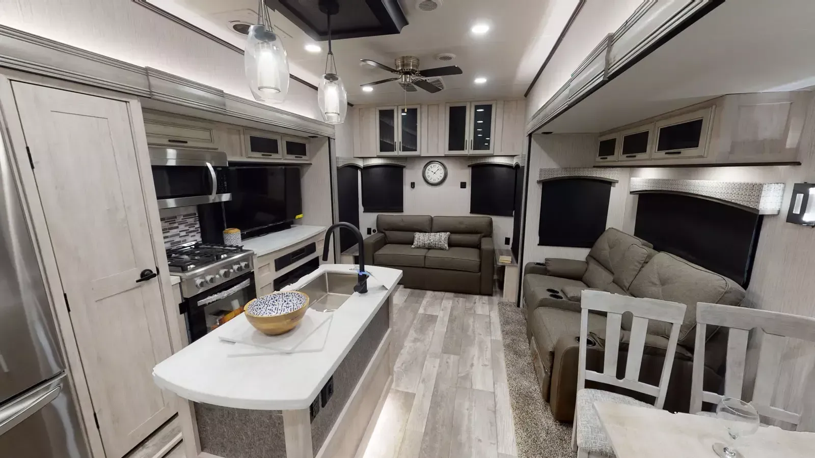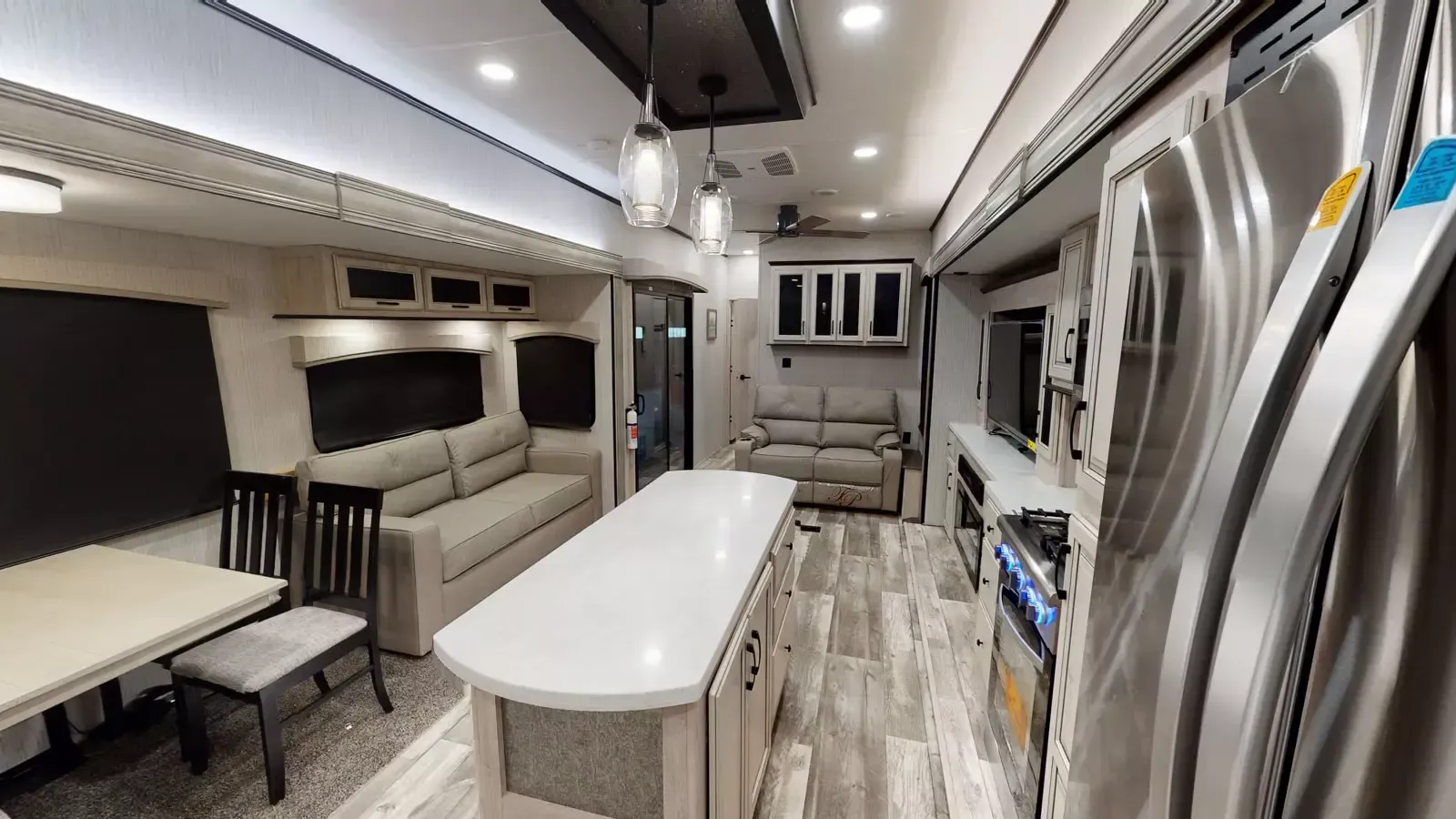 The 399LOFT is the ultimate package in destination living. If you have a full crew with you, or just visitors on the weekends, this floorplan has what you need for all occasions. A residential 22 cubic foot refrigerator, four burner cooktop and floor to ceiling pantry are just a few of the amenities that this floorplan offers. The winding staircase takes you to the top loft where extra sleeping space or storage space awaits.