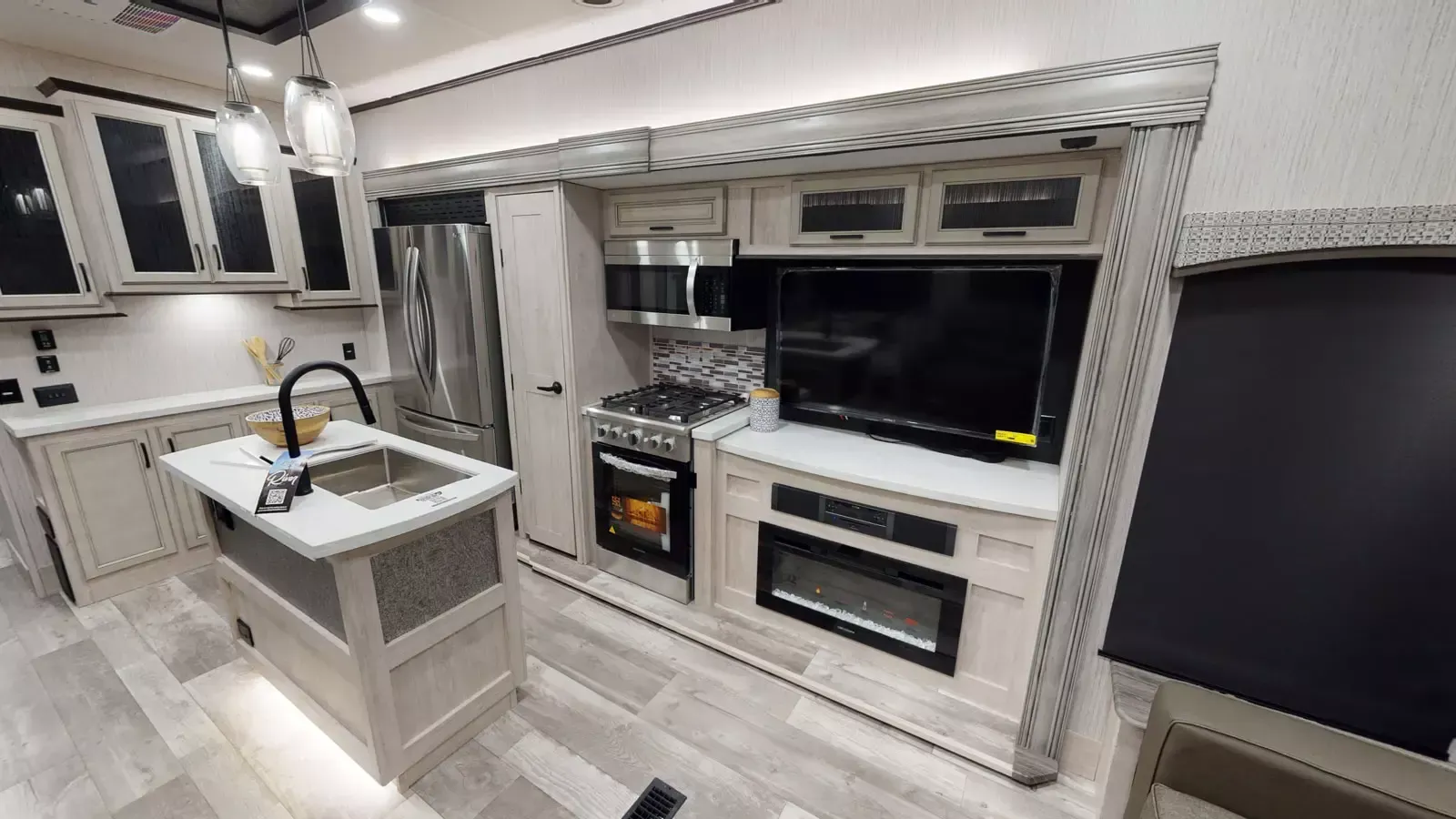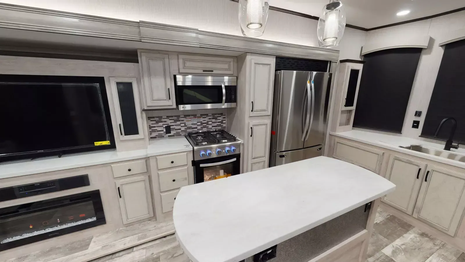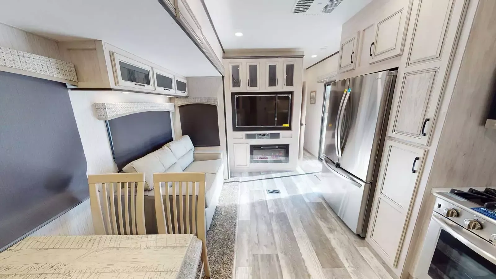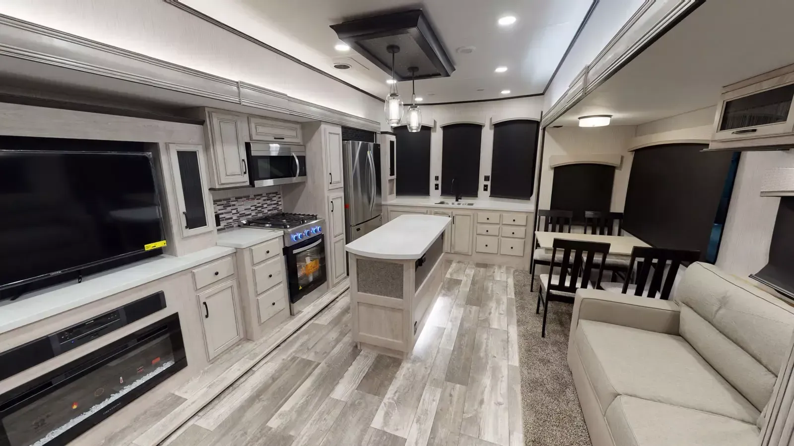 The 399LOFT is the ultimate package in destination living. If you have a full crew with you, or just visitors on the weekends, this floorplan has what you need for all occasions. A residential 22 cubic foot refrigerator, four burner cooktop and floor to ceiling pantry are just a few of the amenities that this floorplan offers. The winding staircase takes you to the top loft where extra sleeping space or storage space awaits.